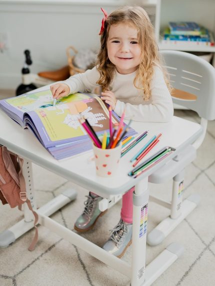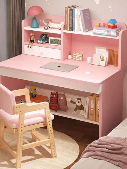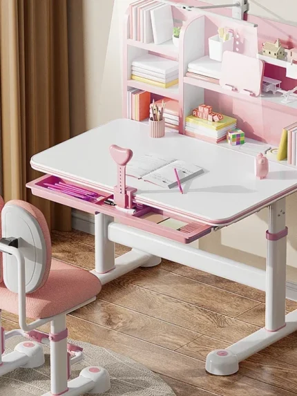 Pink-HC5 Kids Desk and Chair Set Height Adjustable, 31.5″W Ergonomic Children School Writing Study Table with Tilt Desktop, Drawers, LED Lamp, Bookstand, Workstation Office Desk