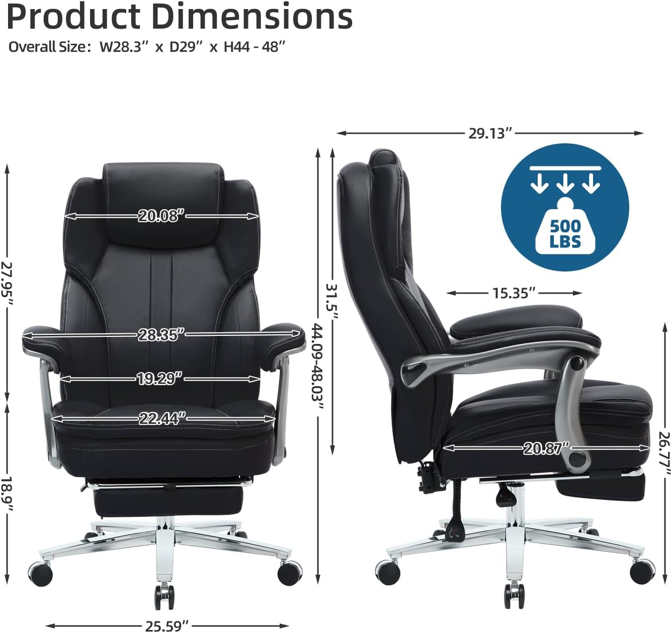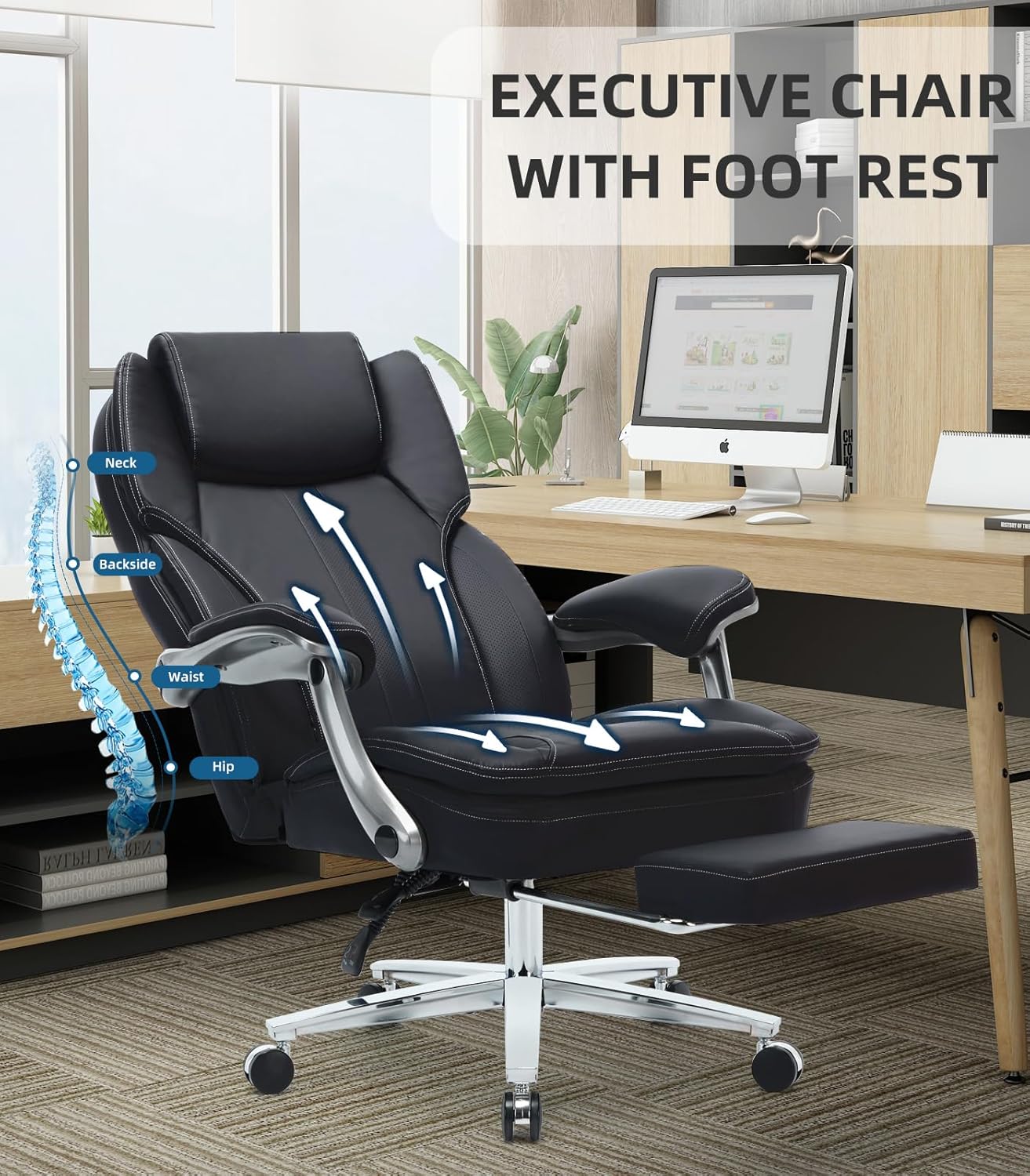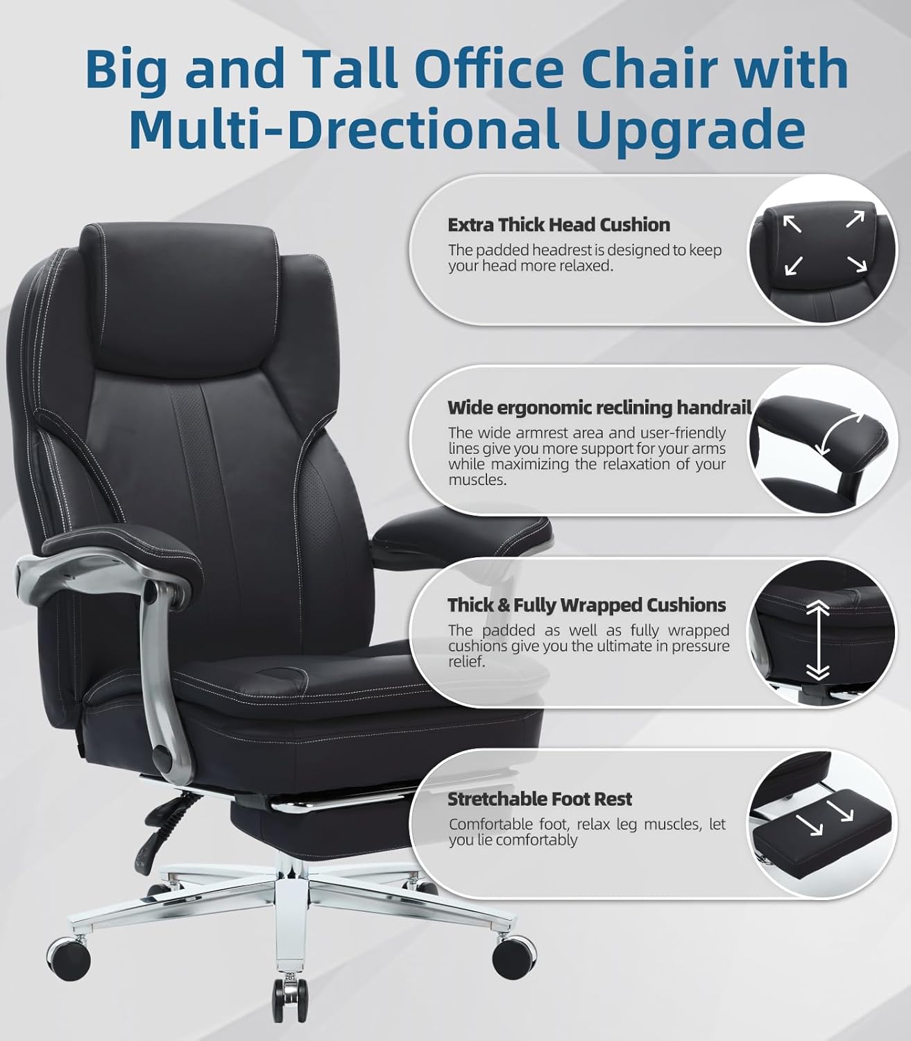 Big and Tall Office Chair with Footrest, Ergonomic High Back Executive Chair with Extra Wide Area Armrest, 500LBS PU Leather Managerial Home Desk Chair with 90-135°Reclining