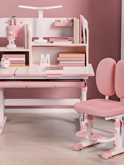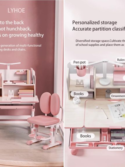 Pink-HC5 Kids Desk and Chair Set Height Adjustable, 31.5″W Ergonomic Children School Writing Study Table with Tilt Desktop, Drawers, LED Lamp, Bookstand, Workstation Office Desk