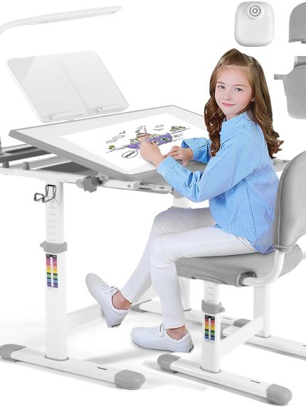Kids Desk and Chair Set Height Adjustable, Ergonomic Kids Study Table with Tilt Desktop, Storage Drawers, LED Light, Bookstand