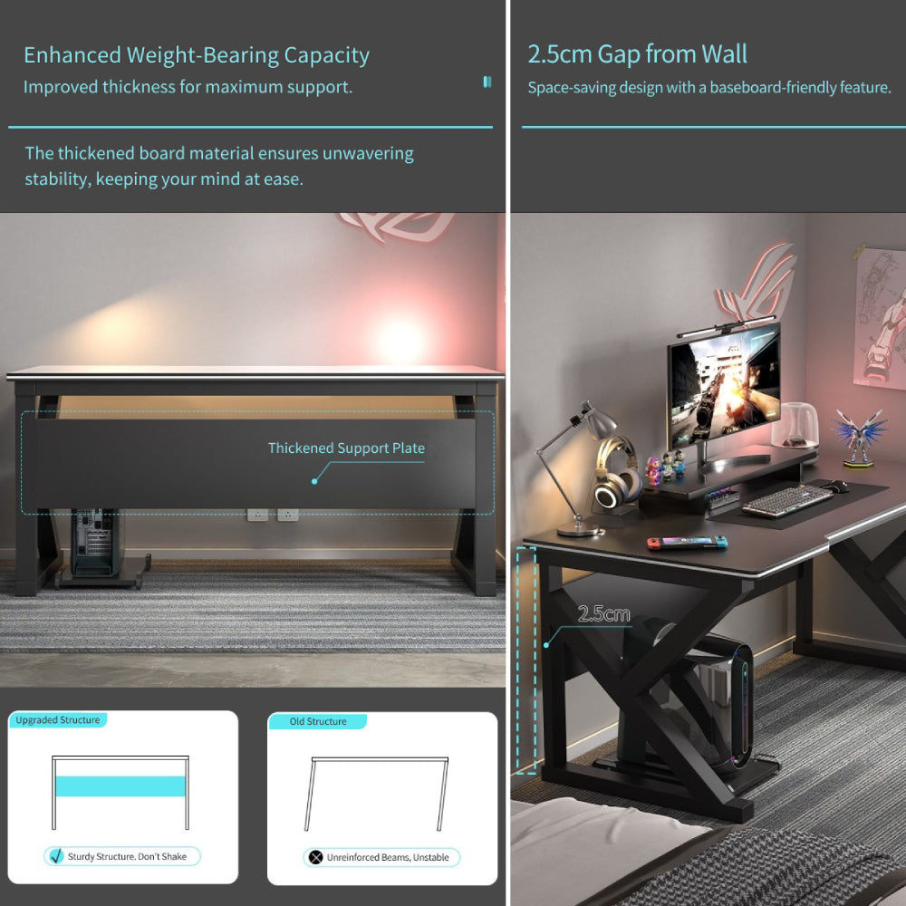 【Stable and Heavy Load】K Type Bold Steel Frame. 40x20mm thick table legs, K-shaped mechanical structure. super strong and stable load.I-shaped steel frame reinforcement. Reinforced Beam Durable Desk, H-shaped reinforced beams, the desk is stable and does not shake, improving the office and gaming experience. Thoughtful design, increase space utilization without occupying the desktop, more convenient storage.