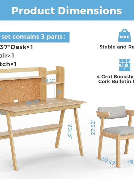 DELAVIN 39.37″ Kids Desk and Chair Set, Solid Wood Desk with Drawers for Kids, Desk Hutch with Cork Bulletin Board, Computer Desk with Chair for Kids, Natural