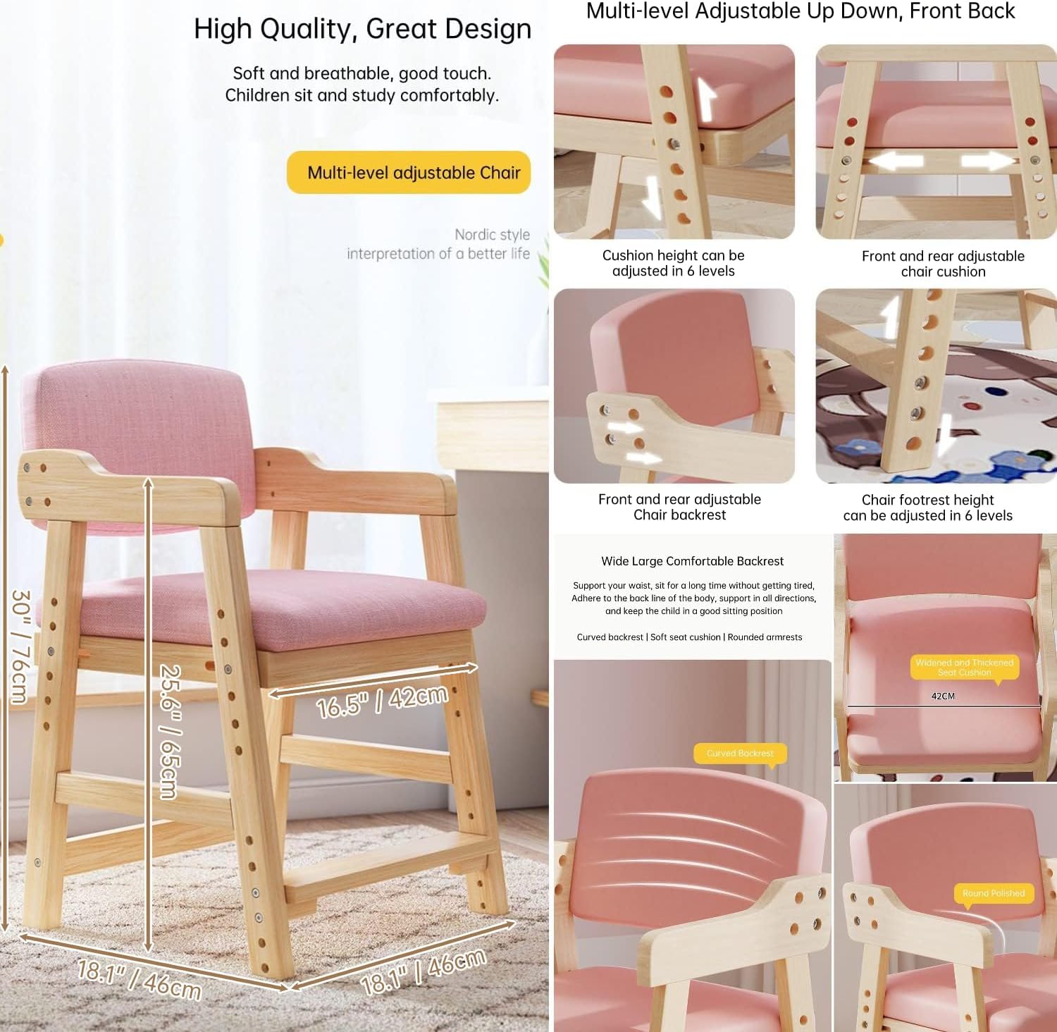 - Multi-level Adjustable: Cushion height adjustable in 6 levels, with front and rear adjustable chair cushion & backrest.