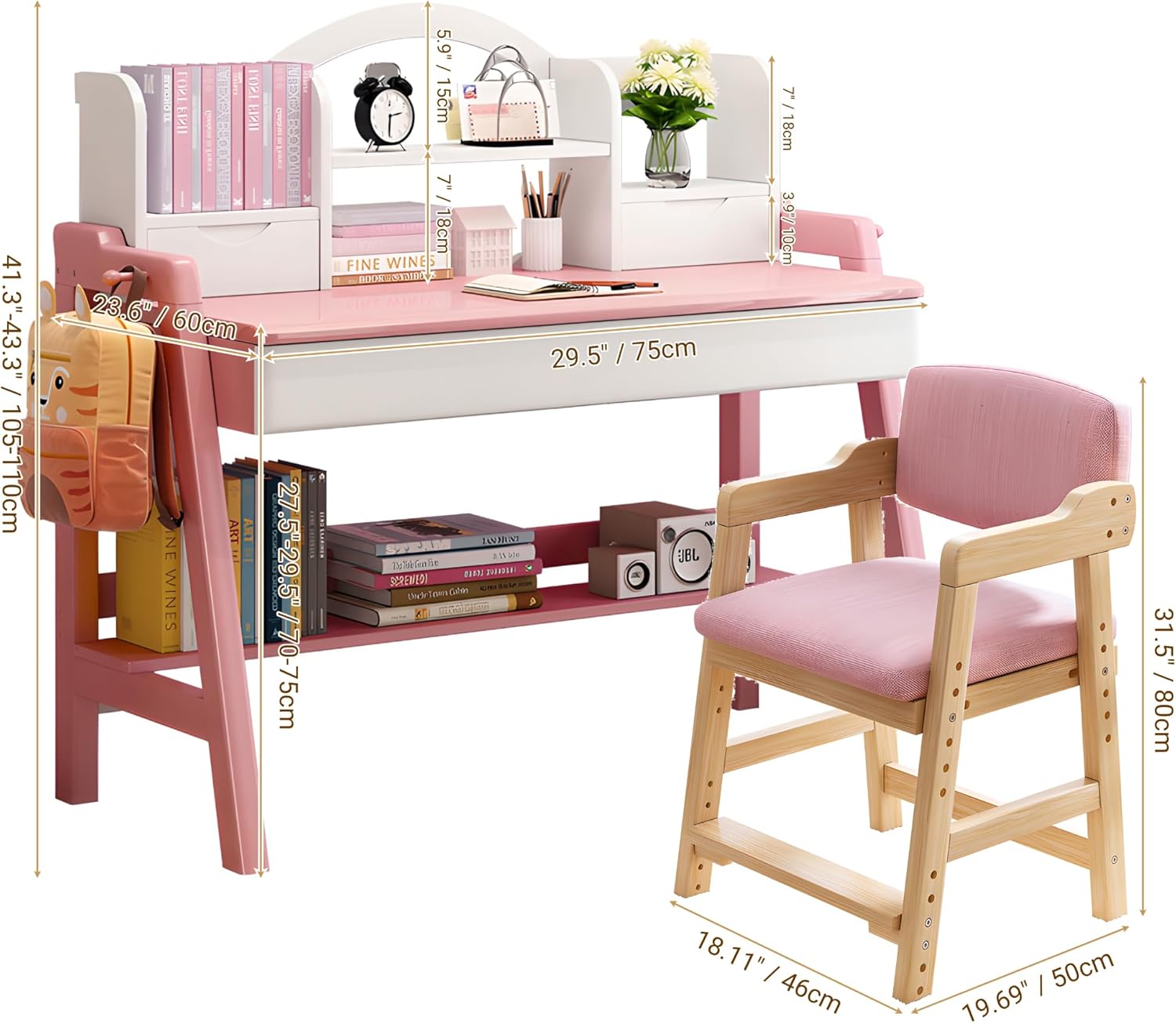 Kids Study Desk and Chair Set, Adjustable Height Solid Wood Bedroom Furniture, Pink Table and Chair with Shelves and Drawer, School Students Home Office Workstation (Pink)