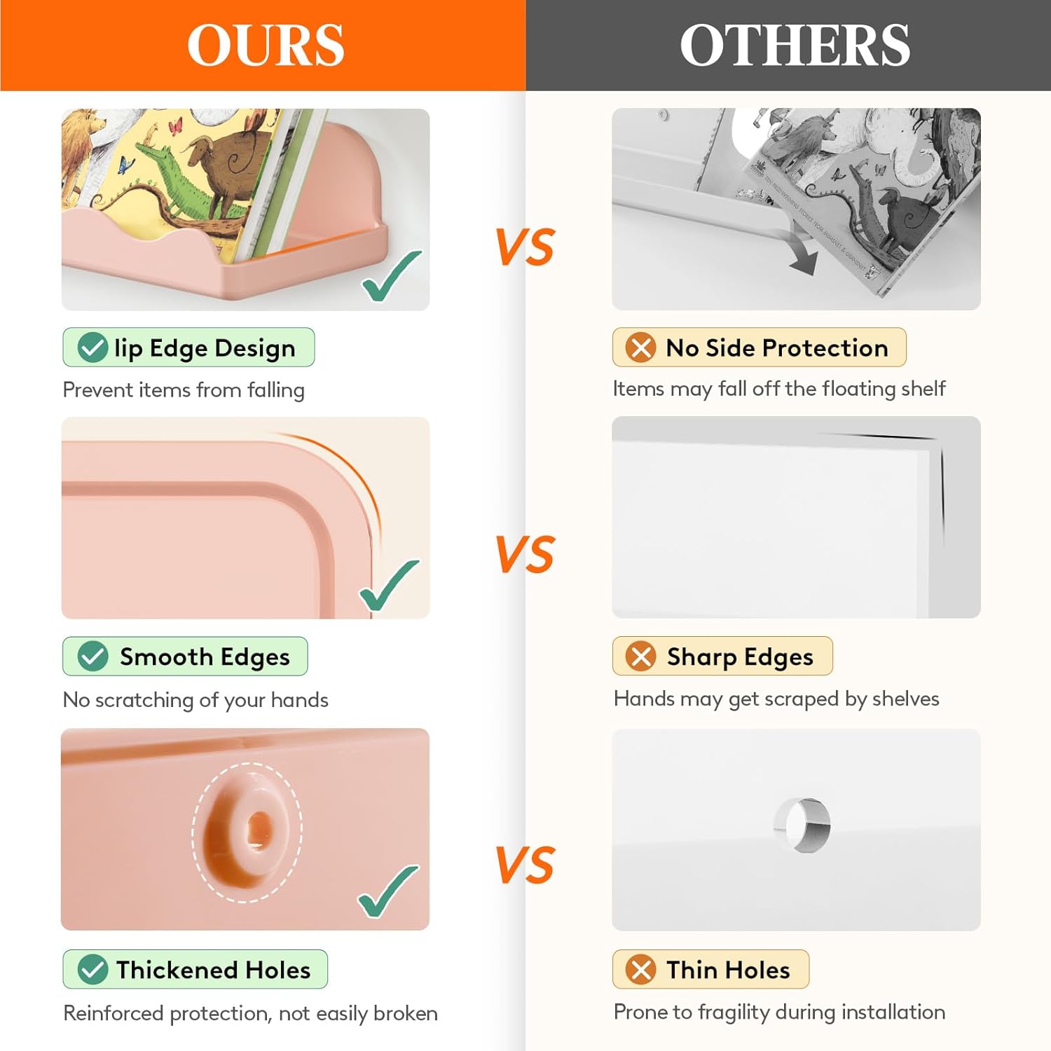 Our lip-shaped kids bookshelf design ensures items stay securely in place.