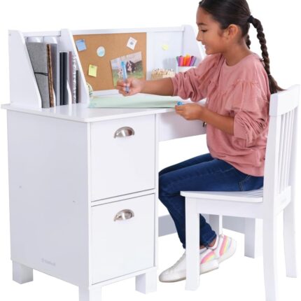 KidKraft Wooden Study Desk for Children with Chair, Bulletin Board and Cabinets, White