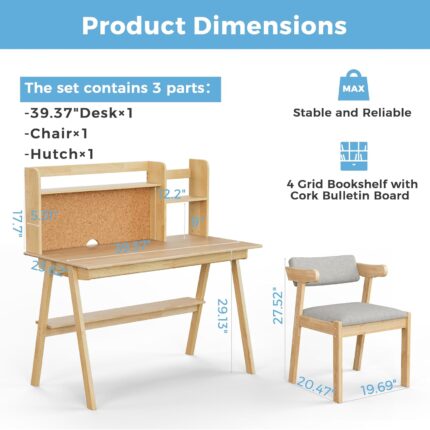 DELAVIN 39.37″ Kids Desk and Chair Set, Solid Wood Desk with Drawers for Kids, Desk Hutch with Cork Bulletin Board, Computer Desk with Chair for Kids, Natural